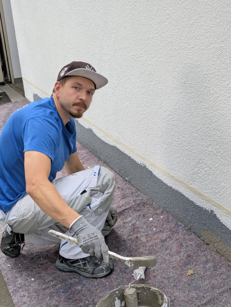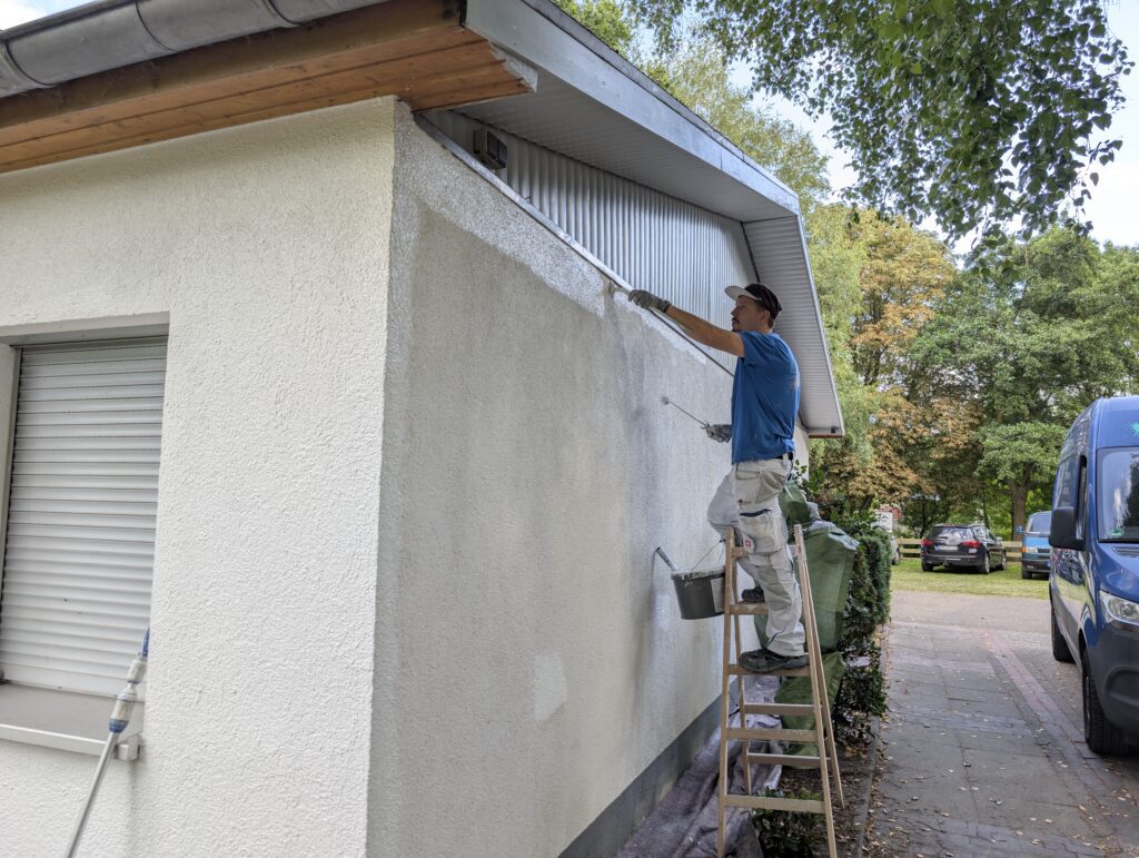 Lars Boltjes besserte die Sockelleiste beim Haus aus und strich sie neu, nachdem er in den letzten fünf Feierabenden das komplette Haus neu gestrichen hatte. Über 10 Jahre hat der alte Anstrich prima gehalten, jetzt musst er aber trotzdem erneuert werden.