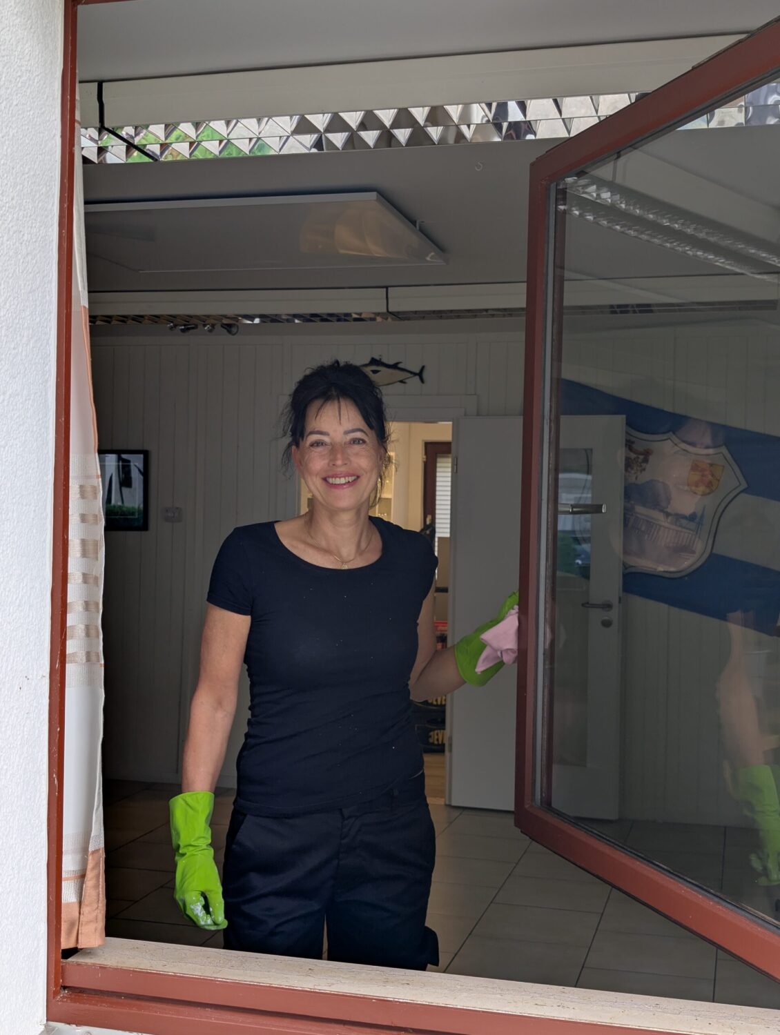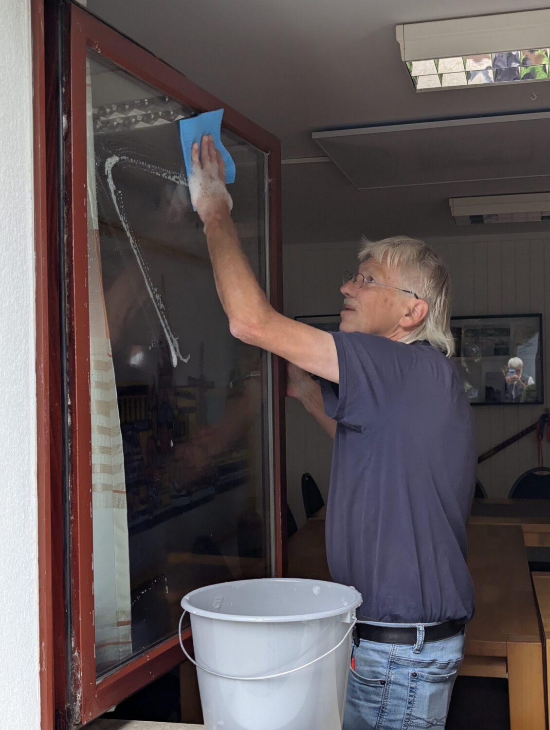 Gabi Mydla und Peter Stör putzen alle Fenster des Vereinshauses sowie die Seglernasszelle und die Dusche.