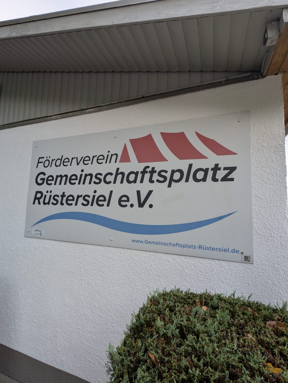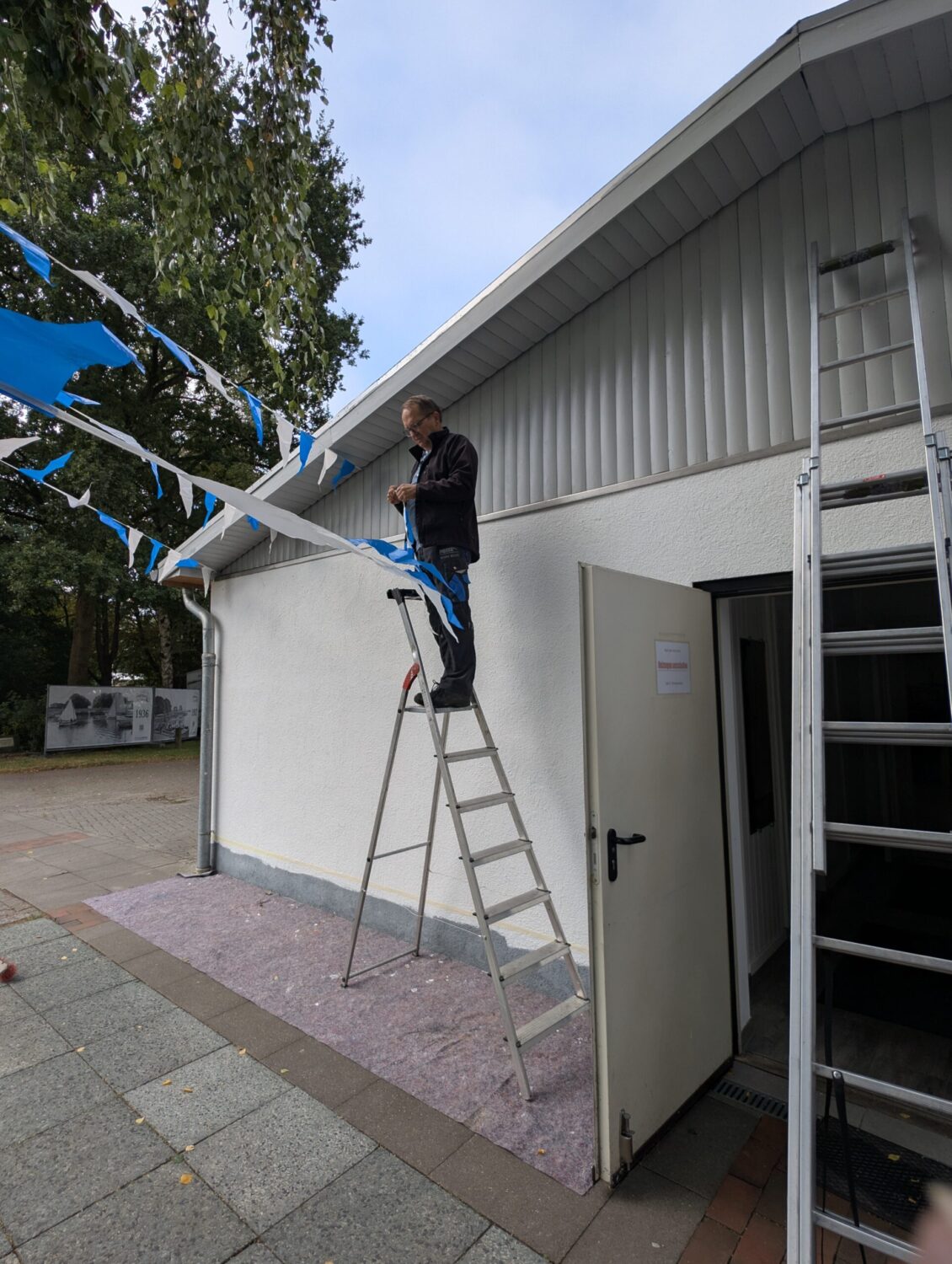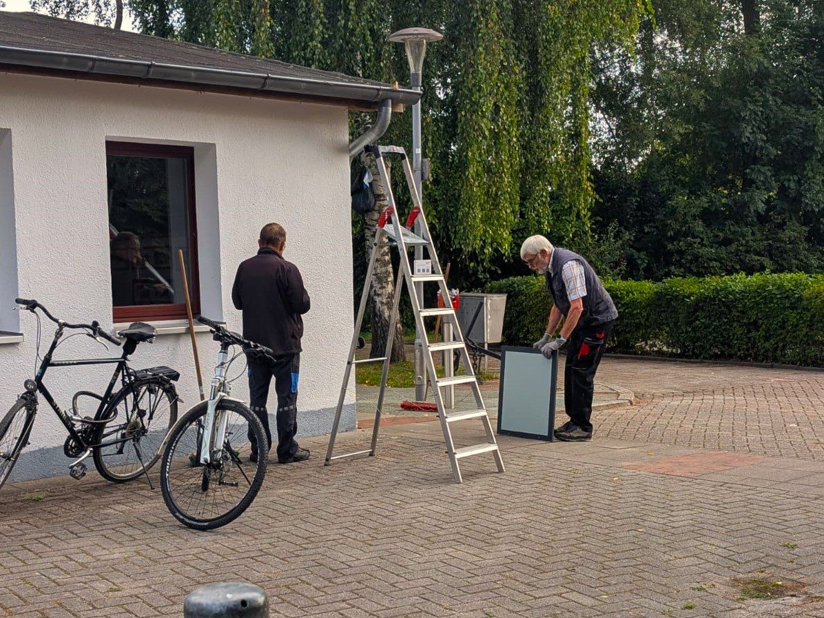 Wolfram Eichhorn und Burkhard Poost brachten nach dem Anstrich das Vereinsschild und das Infoboard wieder an, außerdem wurden die Wimpelketten wieder gesetzt und die Lichterketten wieder eingehängt.