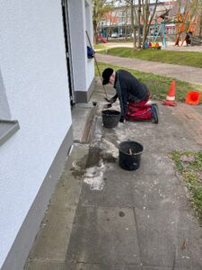 Die Entwässerungsrinnen hinter dem Haus waren prinzipiell eine gute Idee das Wasser vom Haus wegzuhalten. Da sie nur in Sand verlegt, lösten sie sich leider beim Reinigen. Heinz Richter und Wolfram Eichhorn haben die Rinnen nun in Beton verlegt und eine Rinne bis unter den Wasserhahn verlängert.