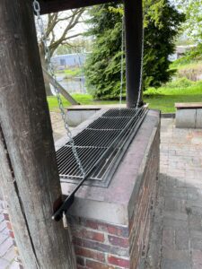 Gerhard Maynicke hatte zur Mitgliederversammlung eine Höhenverstellung an unserem festen Grill vorgeschlagen. Wolfram Eichhorn hat nun eine einfache, aber hoffentlich funktionierende Verstellung über Ketten realisiert. Wir werden es testen.