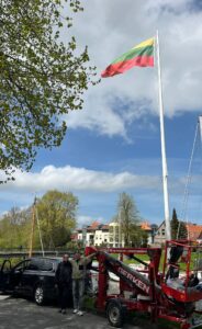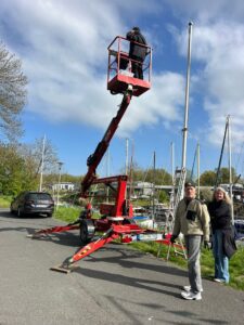 Im Jahr 2018 hatten wir die Fahnenmasten neu streichen lassen und mit neuen Tampen und Rollen ausgestattet. Die Farbe hält bis heute recht gut. Die Tampen waren nach 8 Jahren aber steif und zwei Tampen auch nicht mehr erreichbar. So musste ein Hubsteigereinsatz geplant werden. Gesagt, getan und so hat Wolfram, unterstützt von Michael Dzaczek und Conny Eichhorn einen ganzen Tag an allen 12 Masten Tampen und Rollen gewechselt sowie die Fahnen neu aufgehangen. Mit platzieren und nivellieren der Hubbühne, 12x Stromversorgung und den eigentlichen Arbeiten in luftiger Höhe ein ganz schöner Kraftakt. Dumm nur, wenn fast am Ende der automatische Neigungsausgleich des Korbes versagt und man in 8 m Höhe hängen bleibt. Mit Hilfe des Kundenservices wurde das Problem gelöst, so dass die Arbeiten erfolgreich abgeschlossen werden konnten. So musste Wolfram nicht in 8 m Höhe übernachten. 😊