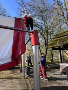 Das Zeltdach ist das Symbol auf unseren Vereinslogo. Passend zur Vorbereitung aufs Osterfeuer haben am 30.03. Heinz Richter, Heiko Schwarting, Gerhard Maynicke und Wolfram Eichhorn das Zelt wieder mit dem Flaschenzug aufgezogen. Beim Festknüpfen des Zeltes war Heikos lange Erfahrung eine große Hilfe.